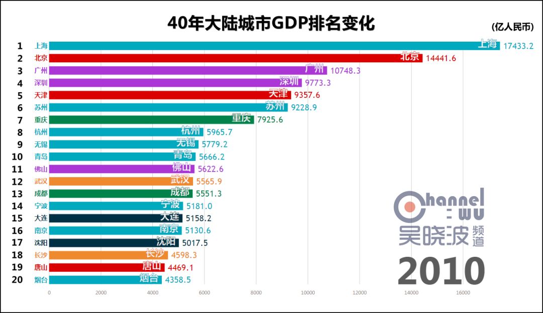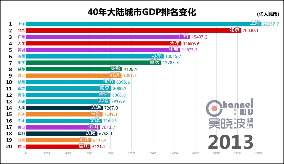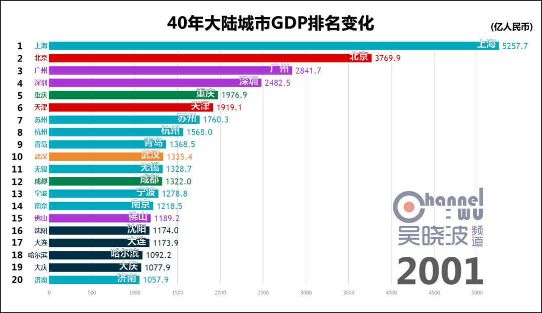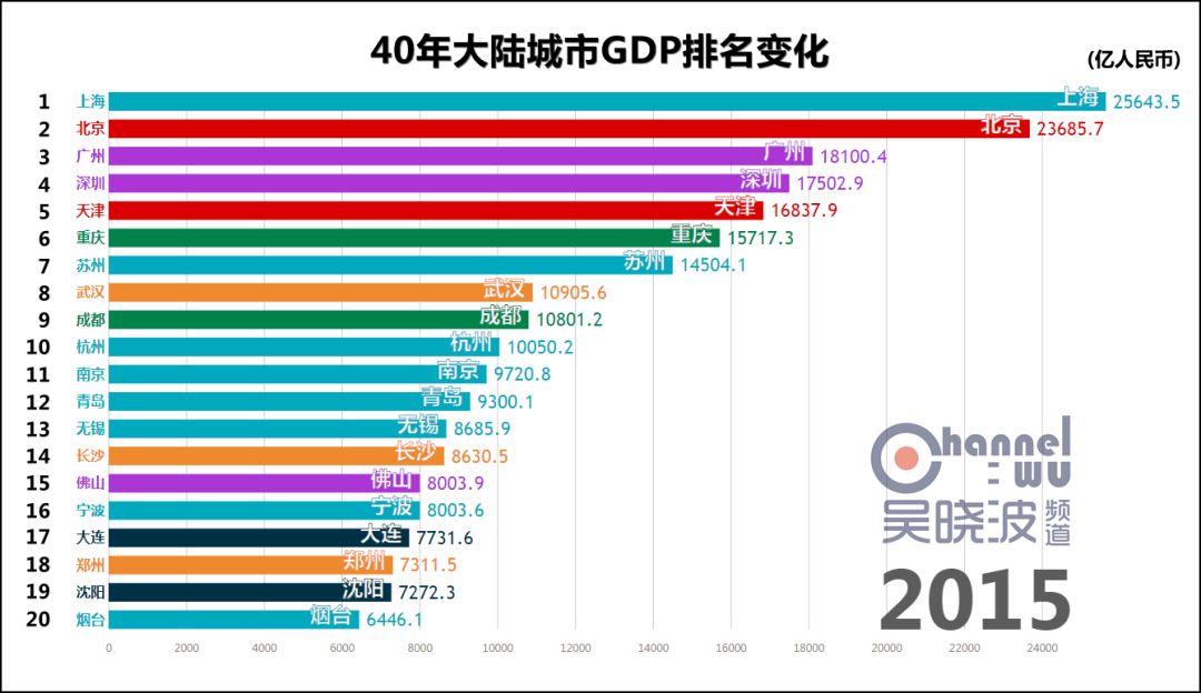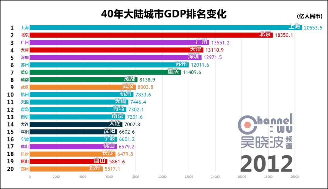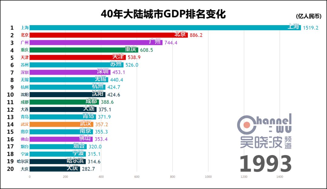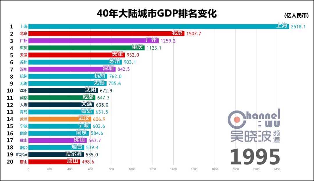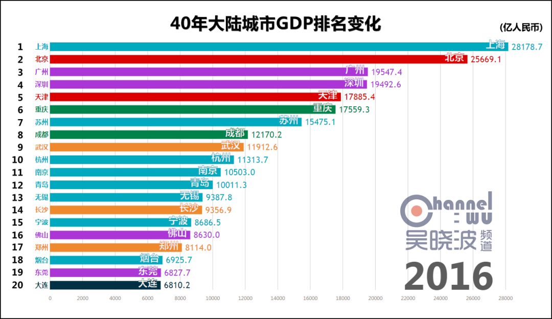 延伸 阅读一 40年城市GDP排名变化,共和国的青春呼啸而过话不多说,请看视频。 数据来源:各地统计年鉴或统计局专门提供 由于历史汇率波动过大等原因,本文排名不含港澳台