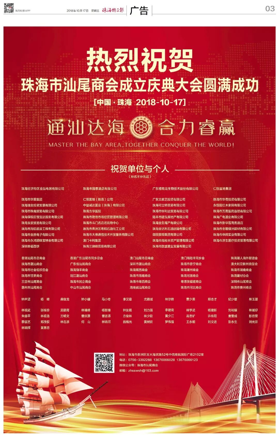 ▲ 刘晨韵领唱会歌 通汕达海,合力睿赢!热烈祝贺珠海市汕尾商会成立庆典圆满成功! 当前,粤港澳大湾区黄金时代已经来临,珠海是一个与港澳毗邻的湾区城市,未来发展商机无限;而汕尾通过与深汕合作区大融合,已成粤港澳大湾区通往粤东的战略支点,正释放出独特的发展潜力。 促进珠汕两地的社会发展和经济繁荣,珠海市汕尾商会,未来使命光荣,必奋勇担当! 愿珠海市汕尾商会如会歌所唱,以饱满的家国情怀,搭乘新时代的东风,永葆敢为人先的气概,拼搏进取腾飞在世界的舞台!