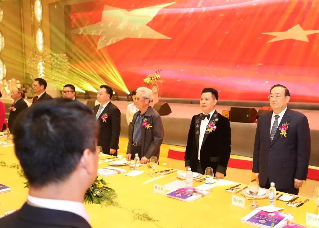 ▲ 领导嘉宾共唱国歌 傲然启航,同心向未来本次庆典的主题是《通汕达海,合力睿赢》。 庆典开始,首先播放《通汕达海 合力睿赢》——商会8分钟视频宣传片。汕尾商会“创一流商会、立百年基业”的大格局、大团结、勇担当的理念和形象,深深震撼着现场来宾! 接着,在雷鸣般的掌声中,林祖武会长上台致词。