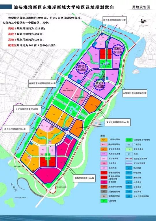 提示:点击上方"潮商"关注我们 汕头东海岸新城一直都在强调修规划,增加产业用地,引进国内高水平大学。据悉,网络上流出关于东海岸建设高校的用地规划图,指出汕头海湾新区东海岸新城大学校区选址规划意向。 大学校区规划总用地约2407亩,约2.5万全日制学生规模。拟分为三个校区和一个配套区,其中:高校1规划用地约为1012亩;高校2规划用地约为690亩;高校3规划用地约为530亩;配套区用地约为265亩(含中心公园),其他规划具体如下图: