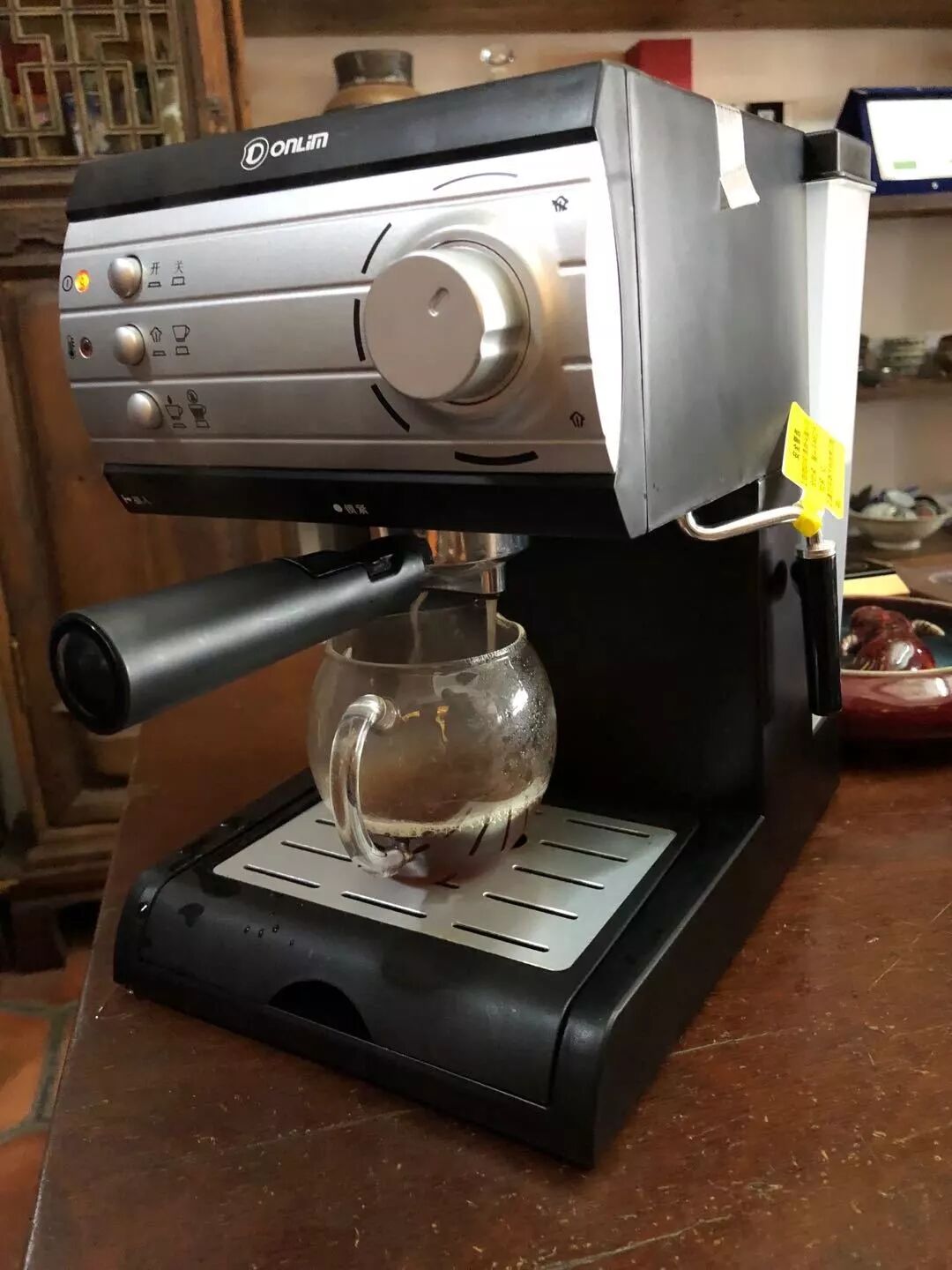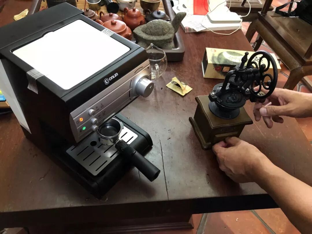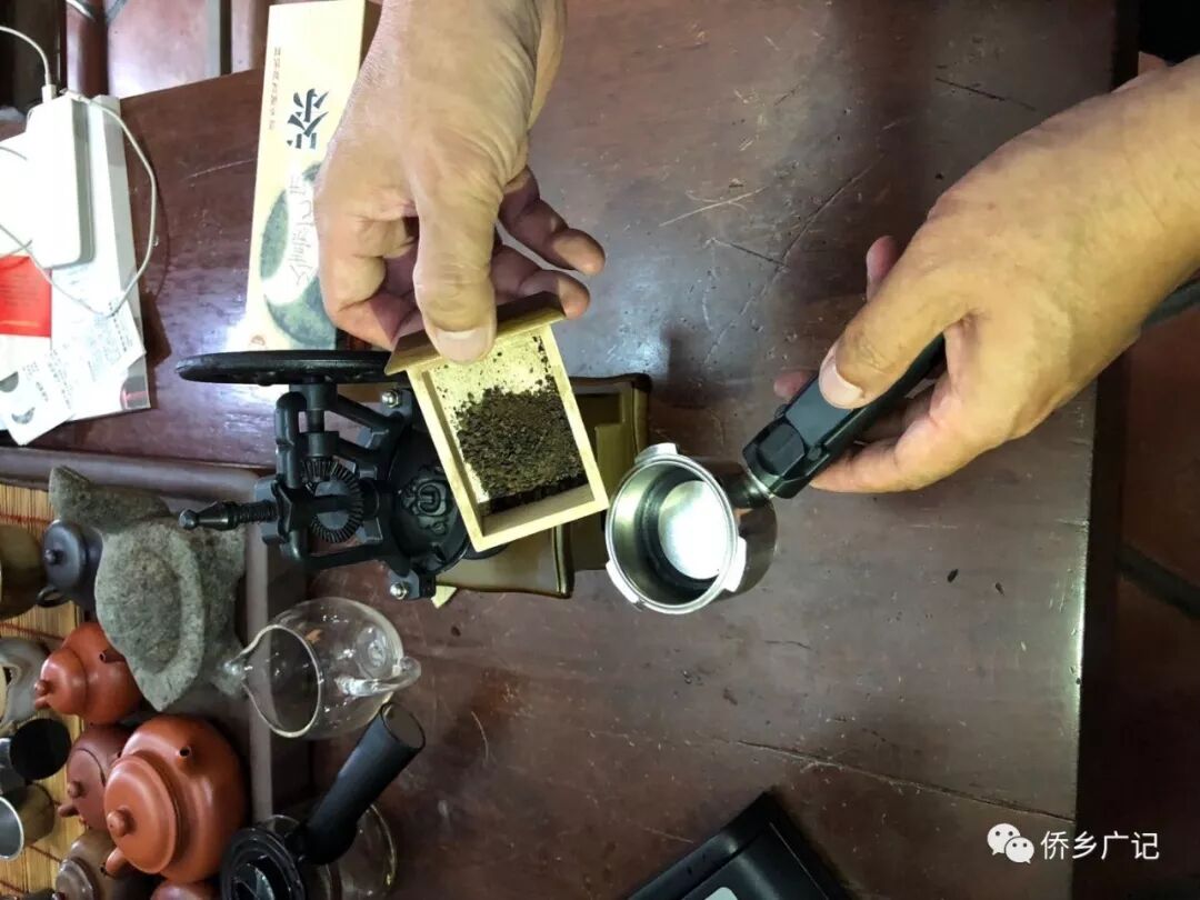 提示:点击上方"潮商"关注我们 凤凰单丛茶也能当咖啡来泡?没错! 前不久带着潮州工夫茶艺亮相法国后,国家级非遗项目潮州工夫茶艺代表性传承人叶汉钟突发奇想,买回了六台咖啡机,将自己研发的单丛茶茶饼进行研磨、冲泡,玩出了“单丛茶咖啡”。 △“单丛茶咖啡”是这样泡出来的△ 近日,在潮州市牌坊街,叶汉钟搬出几台最新购置的咖啡机,开始新的演示。他将像圆形小饼干一样的单丛茶茶饼放进手磨咖啡机,接着摇动手动杆,不一会儿,单丛茶变成一堆粉末。粉末随后被放进另一台自动咖啡机进行冲泡,热气升腾之际,一杯溢着香气的“单丛茶咖啡”便制作完成,黄褐色的茶汤顶部漂浮着一层白色泡沫。