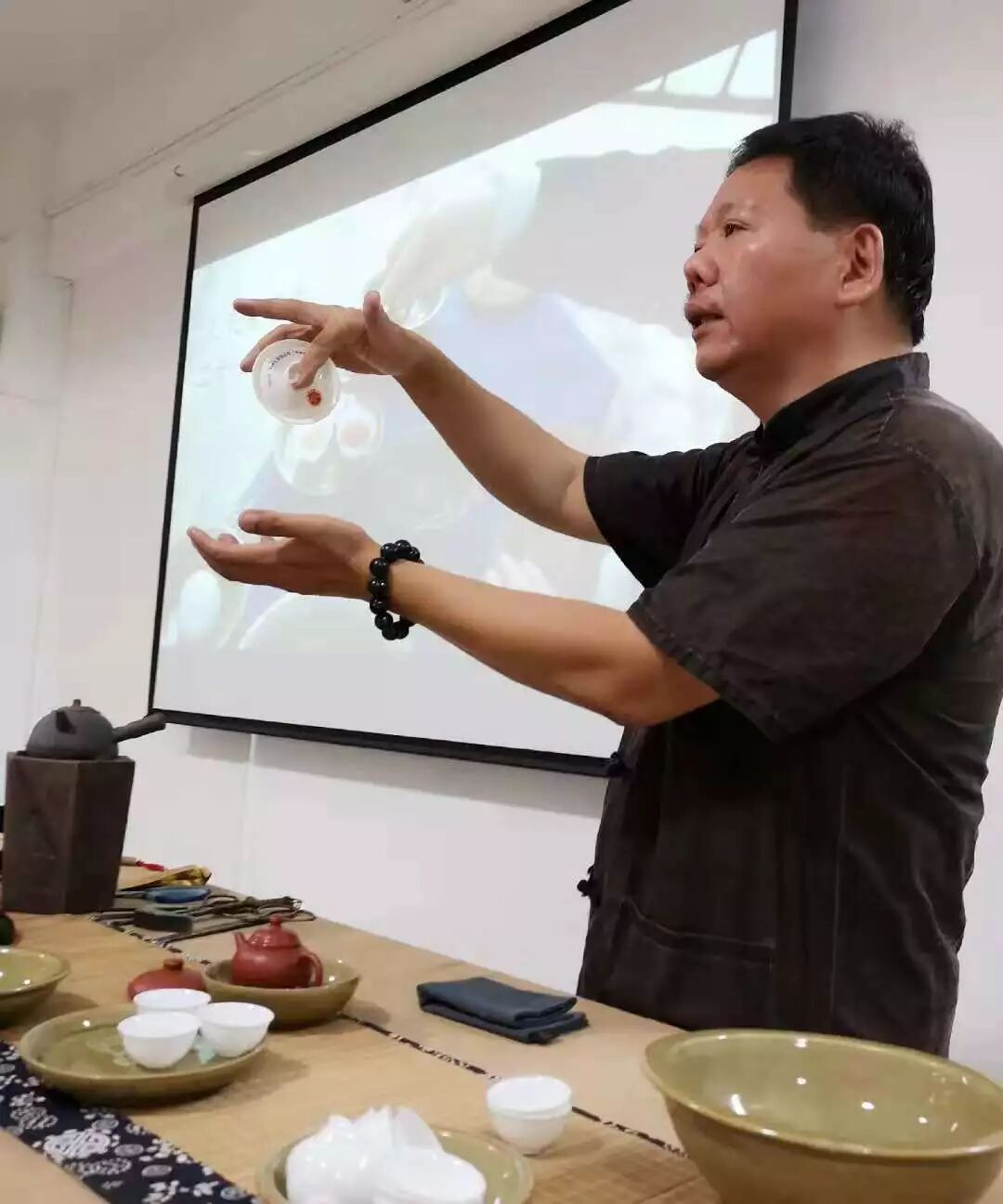 研磨出来的茶粉。 ![]() 自动咖啡机冲泡。 ![]() “单丛茶咖啡”。 记者试饮了一杯,茶里带有咖啡的味道,十分特别。原来,经过精细的研磨,茶叶中含有的咖啡因被进一步释放了出来。 年逾五旬的叶汉钟出生于潮州凤凰山区的“茶叶世家”,是一位名副其实的“双料”非遗传承人——潮州工夫茶艺和凤凰单丛制作技艺的代表性传承人。 2015年4月,由潮州市质监局牵头,潮州市标准协会、潮州工夫茶艺专家参与编制的《潮州工夫茶艺冲泡技术规程》正式发布。此后,包括备器、生火、温壶、纳茶、点茶、请茶、闻香等步骤的潮州工夫茶艺21式风靡各地。叶汉钟是该标准的主要起草人。 ![]() 潮州工夫茶茶具。 三十多年来,叶汉钟一心想要推广潮州茶文化。中国香港、韩国、澳大利亚、意大利等国家和地区都能见到叶汉钟展示潮州工夫茶艺21式的身影。 ![]() 叶汉钟授课。 “跟茶有关的,我都想尝试。”拥有浙江大学茶学研究生教育背景的他,称自己是“玩茶童子”。结合着实操和理论,他将单丛茶玩出了各种花样,玩出了全新的天地。凤凰单丛茶易碎,好茶难免被浪费,叶汉钟觉得可惜。“牛肉丸也不会散!”从潮州菜里得到启发,叶汉钟将好茶的茶末粉碎、搅拌、烘干,做成“泡不散”的单丛茶茶饼,形似圆形小饼干。 ![]() 叶汉钟传授潮州工夫茶艺21式。 叶汉钟说,希望“单丛茶咖啡”能成为向年轻人和外国人推广潮州茶文化的新载体。 来源:侨乡广记 声明:本文不代表我们的观点,仅供读者参考。文章版权归原作者所有,如有侵权,请联系我们进行删除。 潮 商 ∣ 走遍天下 · 根在潮汕 文化的境界 · 财富的智慧