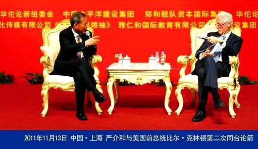“一个论坛”是严介和“华佗论箭”的名义在上海举办了一个中外政商领袖论坛,办得可谓“冠盖云集”,鼎盛至极!嘉宾的阵容有美国前总统克林顿、纽约前市长朱利安尼、爱尔兰前总理埃亨、澳大利亚前总理霍华德,诺贝尔经济学奖获得者菲尔普斯;另外还有不少政府官员,仅邀请的媒体就上百家。